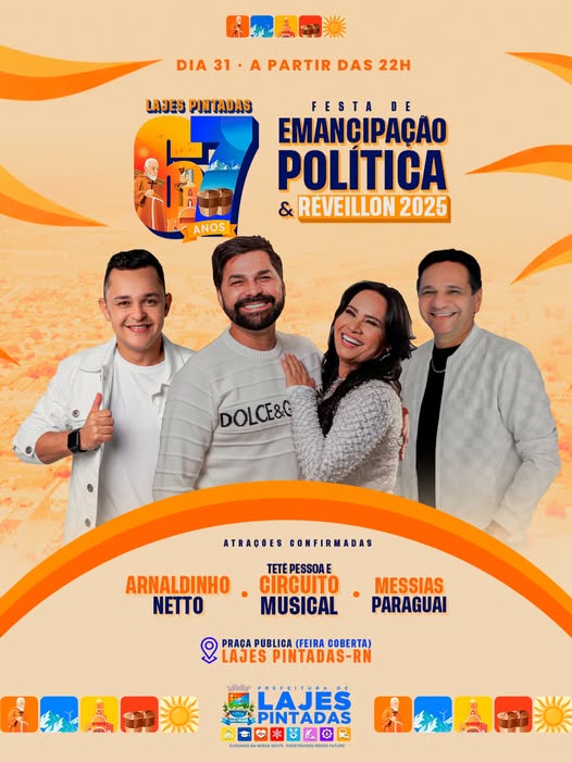 | Lajes Pintadas vai celebrar seus 67 anos de Emancipação Política e o Réveillon 2025! ✨🥂🤍No dia 31 de dezembro, a partir das 22h, convidamos a população de Lajes Pintadas e de toda a região para uma grande festa na Praça Pública (Feira Coberta), marcando mais um momento importante da nossa história.Atrações confirmadas:➡️ Arnaldinho Netto➡️ Tetê Pessoa e Circuito Musical➡️ Messias ParaguaiSerá uma noite especial para comemorar o aniversário da nossa cidade e receber 2025 com alegria, união e muita música. 🤩🤝🫶Cuidando da Nossa Gente, Construindo o Nosso Futuro!