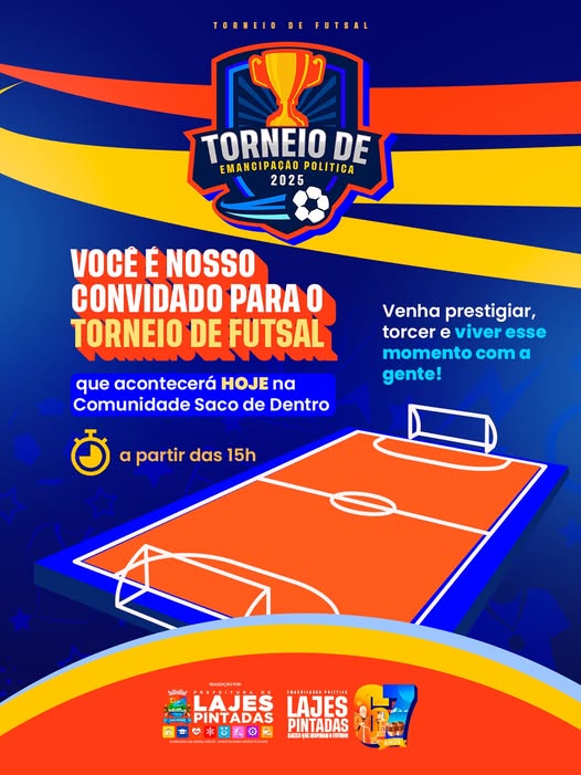67 anos de Emancipação Política | Torneio de Futsal – Emancipação Política 2025.A Prefeitura de Lajes Pintadas convida toda a população para prestigiar o Torneio de Futsal, dentro da programação dos nossos 67 anos de Emancipação Política.O evento acontecerá HOJE, na Comunidade Saco de Dentro, a partir das 15h. Será um momento de integração, alegria e valorização do esporte, reunindo nossa gente em torno da paixão pelo futsal.Venha torcer, vibrar e viver esse momento especial conosco.Cuidando da Nossa Gente, Construindo o Nosso Futuro
