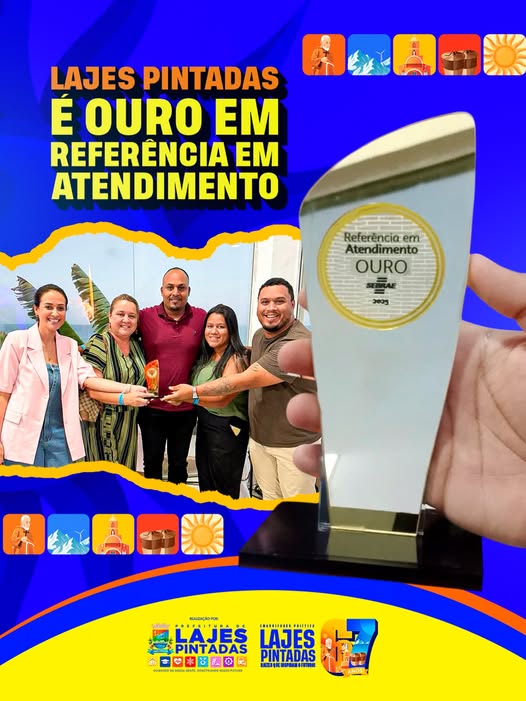 🤝✅A Prefeitura de Lajes Pintadas tem orgulho de anunciar mais uma conquista importante para o nosso município! Recebemos o Prêmio Ouro em Referência em Atendimento, reconhecimento concedido pelo Sebrae aos serviços que se destacam pela qualidade, eficiência e compromisso com a população.Este resultado é fruto do trabalho dedicado de todos que fazem a administração municipal, sempre com foco no atendimento humanizado, transparente e responsável.⠀A cada dia seguimos firmes na missão de oferecer serviços públicos de excelência e construir uma cidade que orgulha a todos.Cuidando da Nossa Gente, Construindo o Nosso Futuro!
