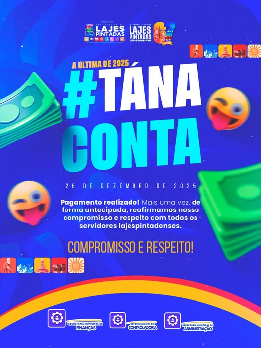 67 anos de Emancipação Política | Nesta sexta, 26 de dezembro de 2025, a Prefeitura Municipal de Lajes Pintadas, através da Secretarias de Administração e Finanças, além da Controladoria Municipal, realizaram o pagamento antecipado dos servidores lajespintadenses.Seguimos reafirmando o compromisso e o respeito com todos que fazem o serviço público do nosso município.Cuidando da Nossa Gente, Construindo o Nosso Futuro!