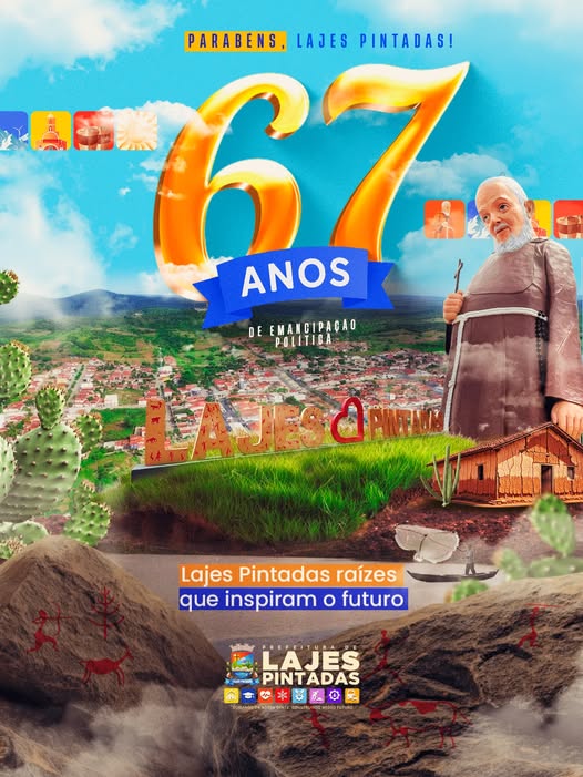 | Parabéns, Lajes Pintadas 🥳🤩🫶Hoje, Lajes Pintadas completa 67 anos de história viva, um marco de orgulho para cada lajespintadense que carrega no peito o amor por esta terra abençoada.Nestes 67 anos, nossa gente construiu raízes profundas, cheias de fé, união e superação. Cada conquista, cada sorriso compartilhado, cada mão estendida reflete o espírito lajespintadense que transforma desafios em força e sonhos em realidade.Parabéns, Lajes Pintadas! Parabéns a cada lajespintadense por esses 67 anos de luta, fé e amor pela nossa terra! Que nosso futuro seja ainda mais brilhante, unido e próspero.Cuidando da Nossa Gente, Construindo o Nosso Futuro!