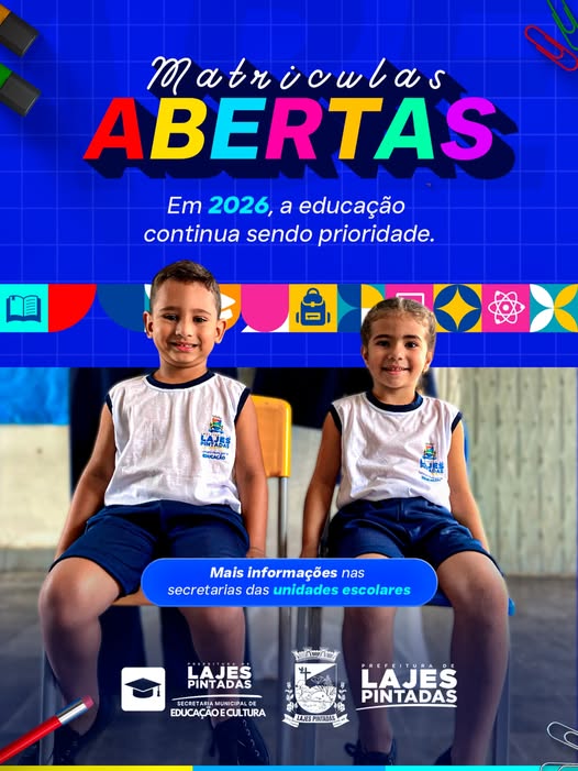 As matrículas para o ano letivo de 2026 na Rede Municipal de Ensino de Lajes Pintadas estão oficialmente abertas. Pais e responsáveis têm a oportunidade de garantir a vaga dos seus filhos nas escolas do município, reforçando o compromisso da gestão municipal com a educação de qualidade. A Secretaria Municipal de Educação e Cultura prioriza o acesso universal ao ensino, acolhendo todas as crianças e adolescentes da comunidade.Para realizar a matrícula, basta dirigir-se à secretaria da unidade escolar mais próxima da sua residência. As equipes das escolas estão preparadas para orientar sobre os turnos disponíveis, etapas de ensino e eventuais dúvidas, garantindo um processo simples e ágil.Juntos, família e escola constroem um futuro melhor para Lajes Pintadas. Não perca tempo e realize já a matrícula do seu filho ou filha – a educação é o caminho para o desenvolvimento de todos. Para mais informações, procure qualquer unidade escolar da rede municipal.Cuidando da Nossa Gente, Construindo Nosso Futuro